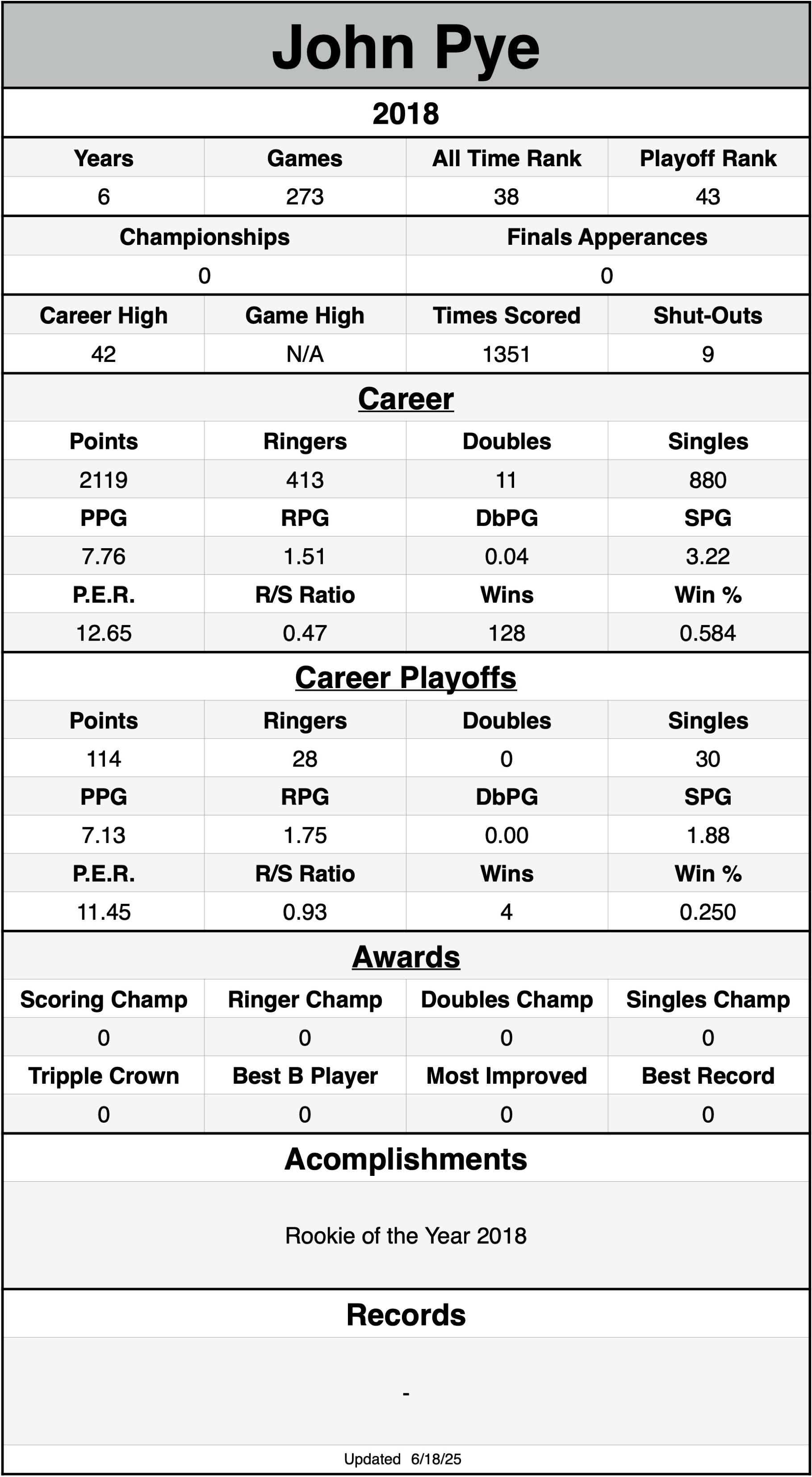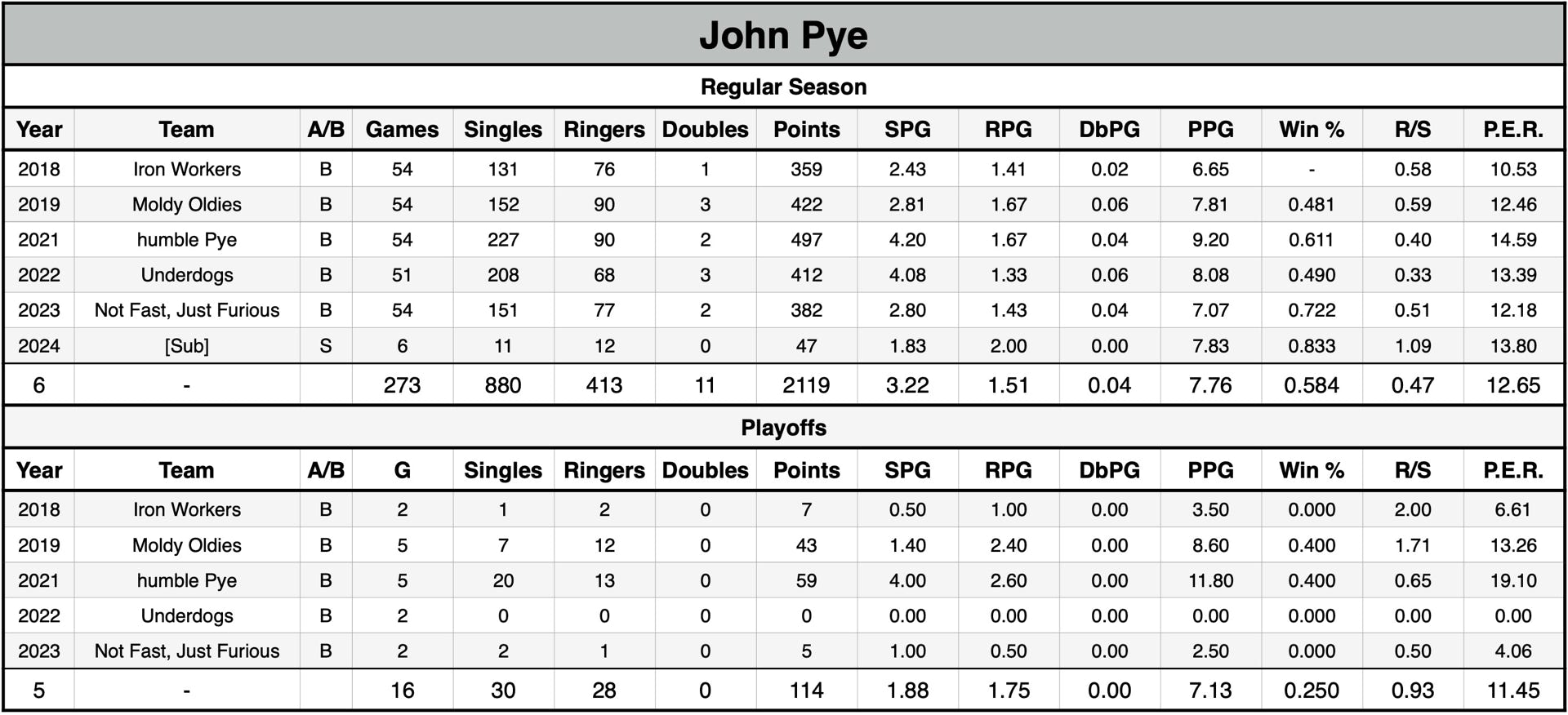 P.E.R. may currently be listed lower than actual P.E.R. for seasons without shut-out data