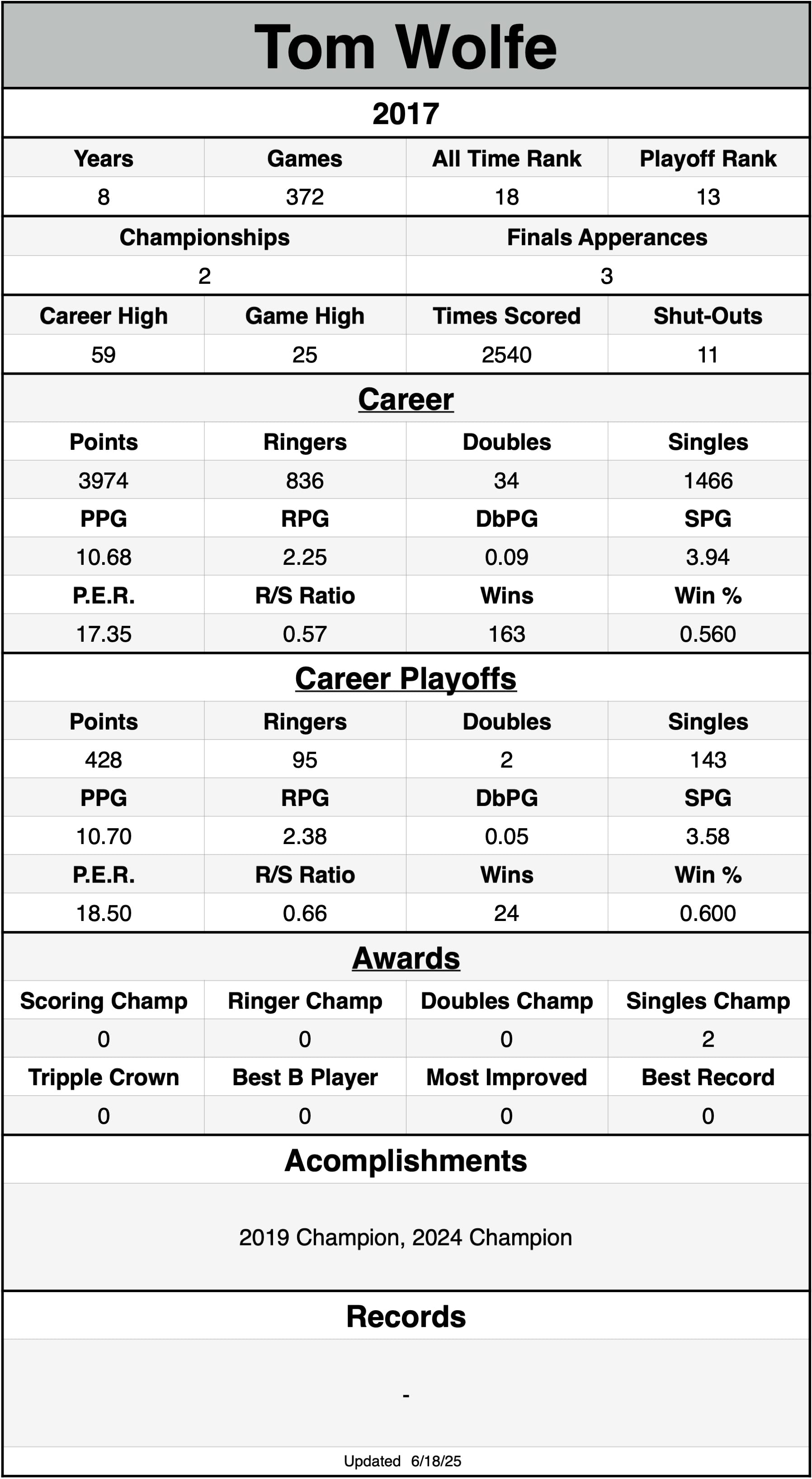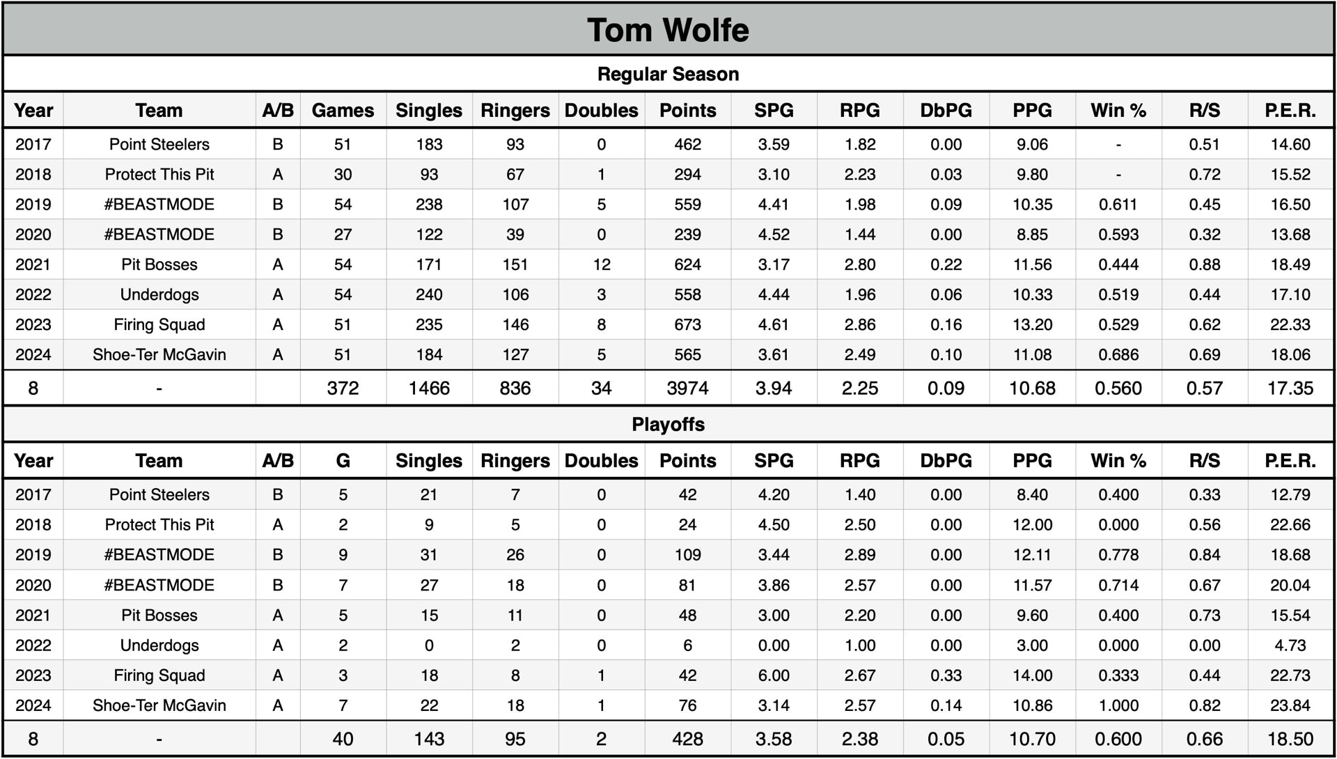 P.E.R. may currently be listed lower than actual P.E.R. for seasons without shut-out data