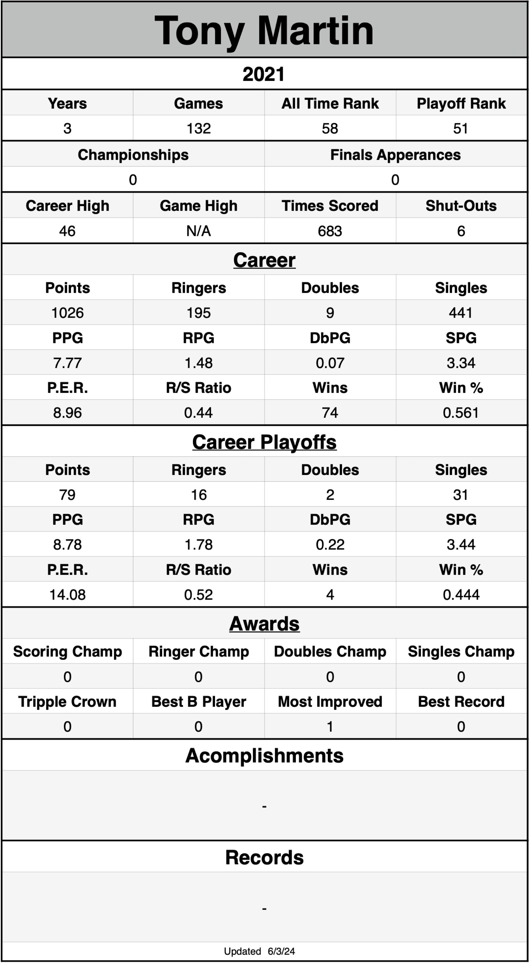 Singles stats were not recorded until the 2007 season.